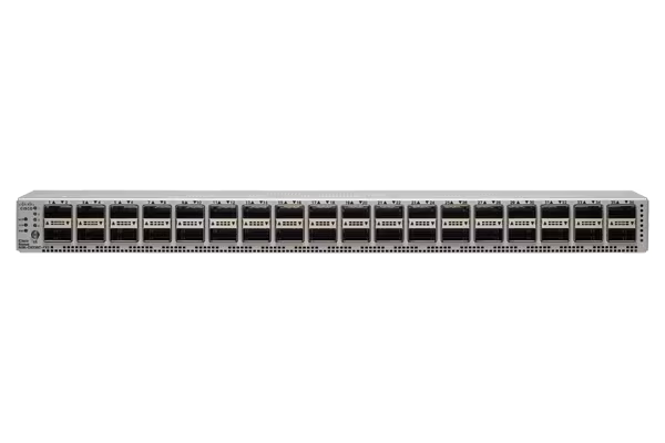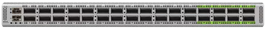 In Figure 2 Above The Cisco Nexus 9332D-GX2B is a compact form-factor 1-Rack-Unit (1RU) switch that supports 25.6 Tbps of bandwidth and 4.17 bpps across 32 fixed 400G QSFP-DD ports and two fixed 1/10G SFP+ ports (Figure 3). QSFP-DD ports also support native 200G (QSFP56), 100G (QSFP28) and 40G (QSFP+). Each port can also support 4x10G, 4x25G, 4x50G, 4x100G, and 2x200G breakouts. The last eight ports, marked in green, are capable of wire-rate MACsec encryption.